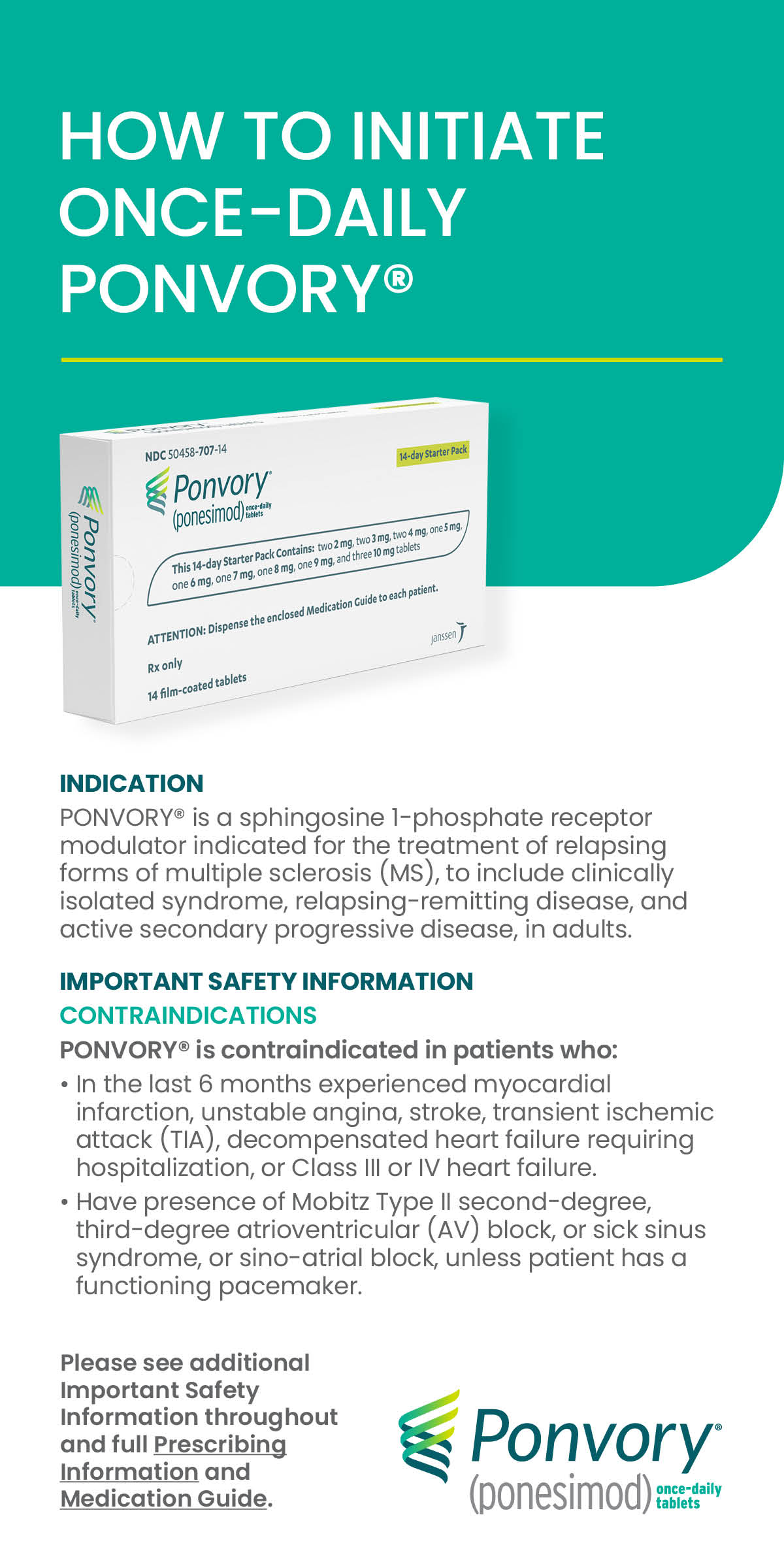 PONVORY® is a sphingosine 1-phosphate receptor modulator indicated for the treatment of relapsing forms of multiple sclerosis (MS), to include clinically isolated syndrome, relapsing-remitting disease, and active secondary progressive disease, in adults.